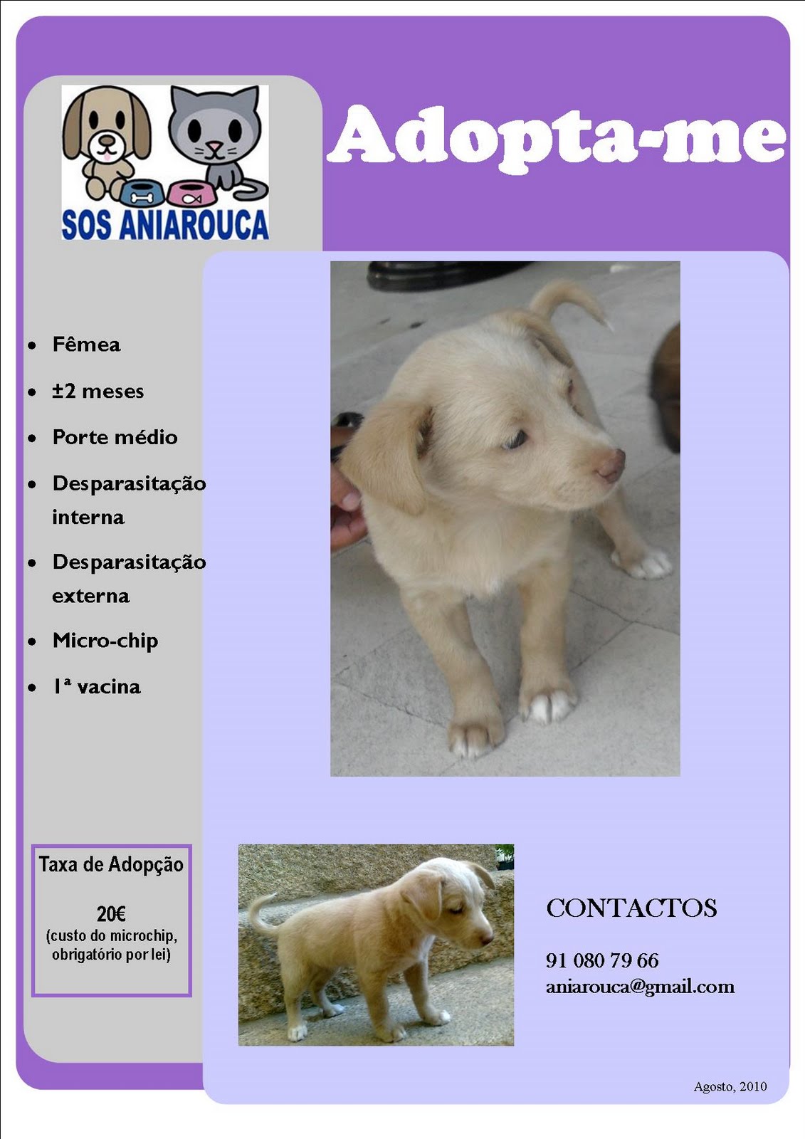 Será entregue vacinada, desparasitada e microchipada. O Adoptante terá que custear uma taxa de adopção no valor de 20,00 €.
